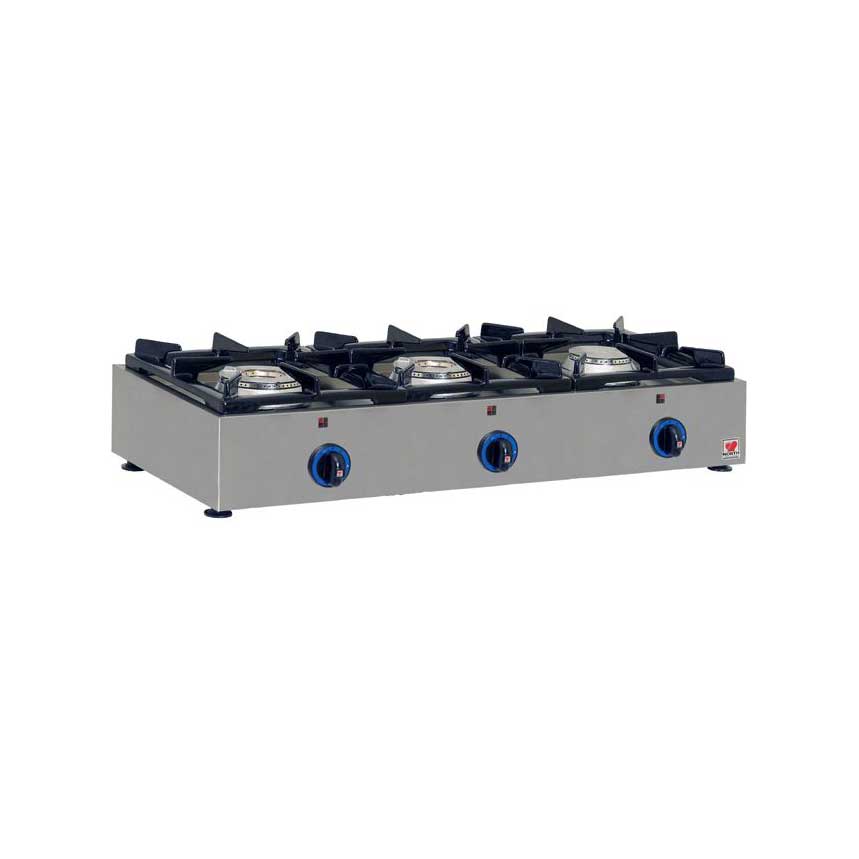 Επιτραπέζιο φλόγιστρο υγραερίου GAS E23 με 3 εστίες με διπλή καύση (εσωτερικά & εξωτερικά ) για γρήγορα αποτελέσματα. Η συσκευή διαθέτει αποσπώμενα μέρη όπως σχάρες-καυστήρες και λεκάνη περισυλλογής για τον εύκολο καθαρισμό της. Επίσης είναι εξοπλισμένη με όλα τα εξαρτήματα ασφάλειας όπως θερμοκόπια και πιλότο. Μπορεί να συνδεθεί Φυσικό αέριο ή Προπάνιο-Βουτάνιο